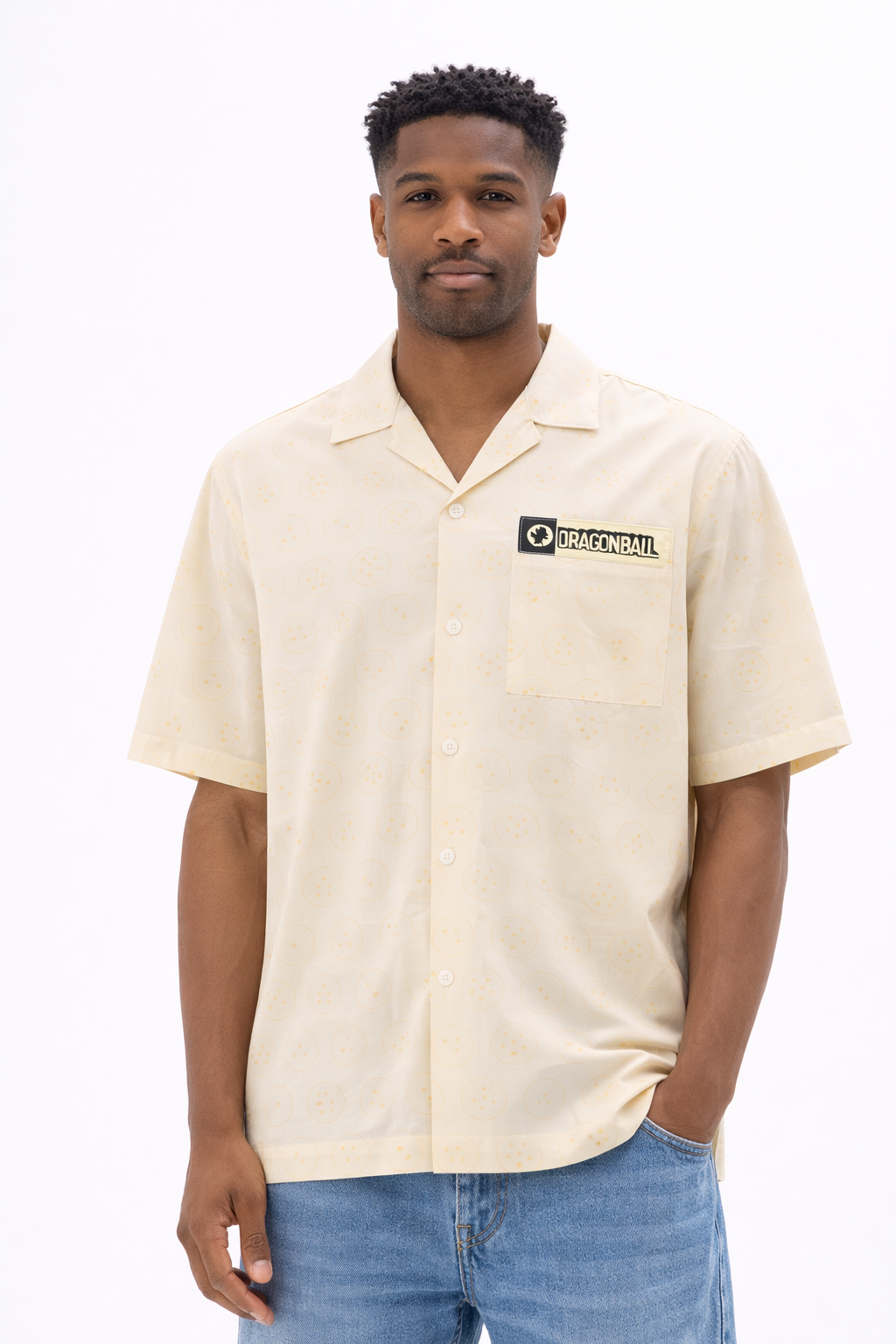 Designed for fans of iconic anime culture, this men’s shirt brings a laid-back style inspired by the Dragon Ball universe. Featuring a beige base with a crystal ball print, it’s cut in a comfortable regular fit with short sleeves and a relaxed Cuban collar. A button-down front and chest patch pocket add practical detail, making it an easy choice for casual days. Pair it with shorts or trousers from our collection for a complete look.